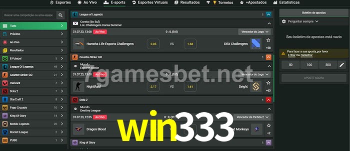 O win333 oferece uma grande seleção de opções de apostas em e-sports com probabilidades competitivas